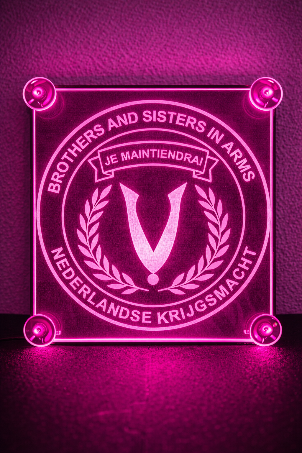 Geef jouw ruimte een krachtige en betekenisvolle uitstraling met dit Veteraan LED lichtbord. Het gegraveerde ontwerp, geïnspireerd op de Nederlandse krijgsmacht en het motto “Brothers and Sisters in Arms”, wordt stijlvol verlicht met energiezuinige LED-verlichting en zorgt voor een indrukwekkend visueel effect.